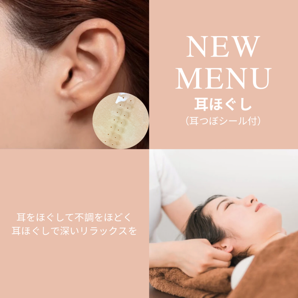 耳ほぐし(耳つぼシール付)が新しく追加!耳や耳まわりをほぐして血行や巡りを整え、耳つぼシールを貼って継続的に刺激してお体の不調を改善♪リフレやもみほぐしなど他のコースと組合せてお受けできます😊その他豊富なメニューで一年頑張った心と体にご褒美を✨