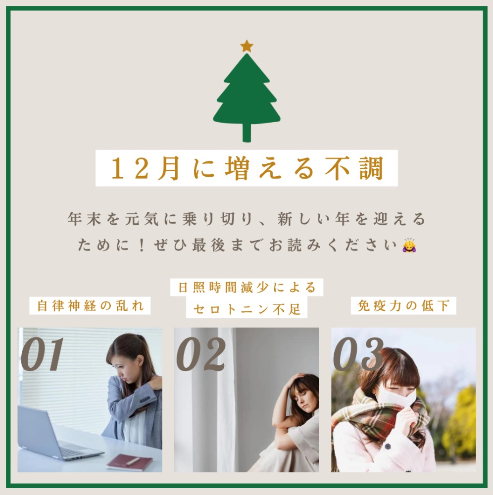 しかし、12月は寒さが厳しくなり、首肩凝りや頭痛、冷えなどの不調、さらに、年末の忙しいさも重なり、体への負担が大きくなる季節でもあります。体の不調をそのままにしておくと、年明けに悪化なんてことも😱